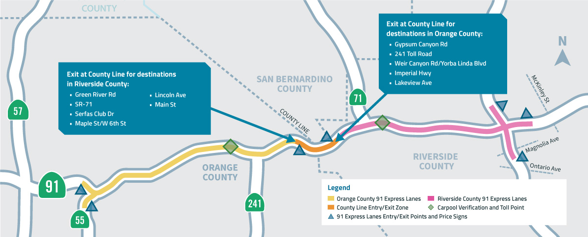 Approximately a quarter mile prior to each entry point an overhead sign shows the toll to travel to the posted destination(s). If you travel the 91 Express Lanes from end-to-end and the 15 Express Lanes, you will pay three tolls. The tolls will be displayed on three toll rate signs: the Orange County sign, the Riverside County sign and the 15 Express Lanes sign. The map below can be used as a guide to understand the signs and their corresponding tolls.