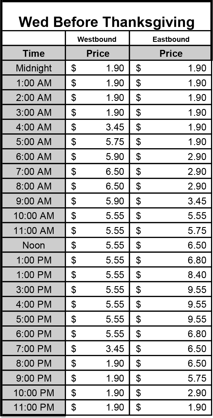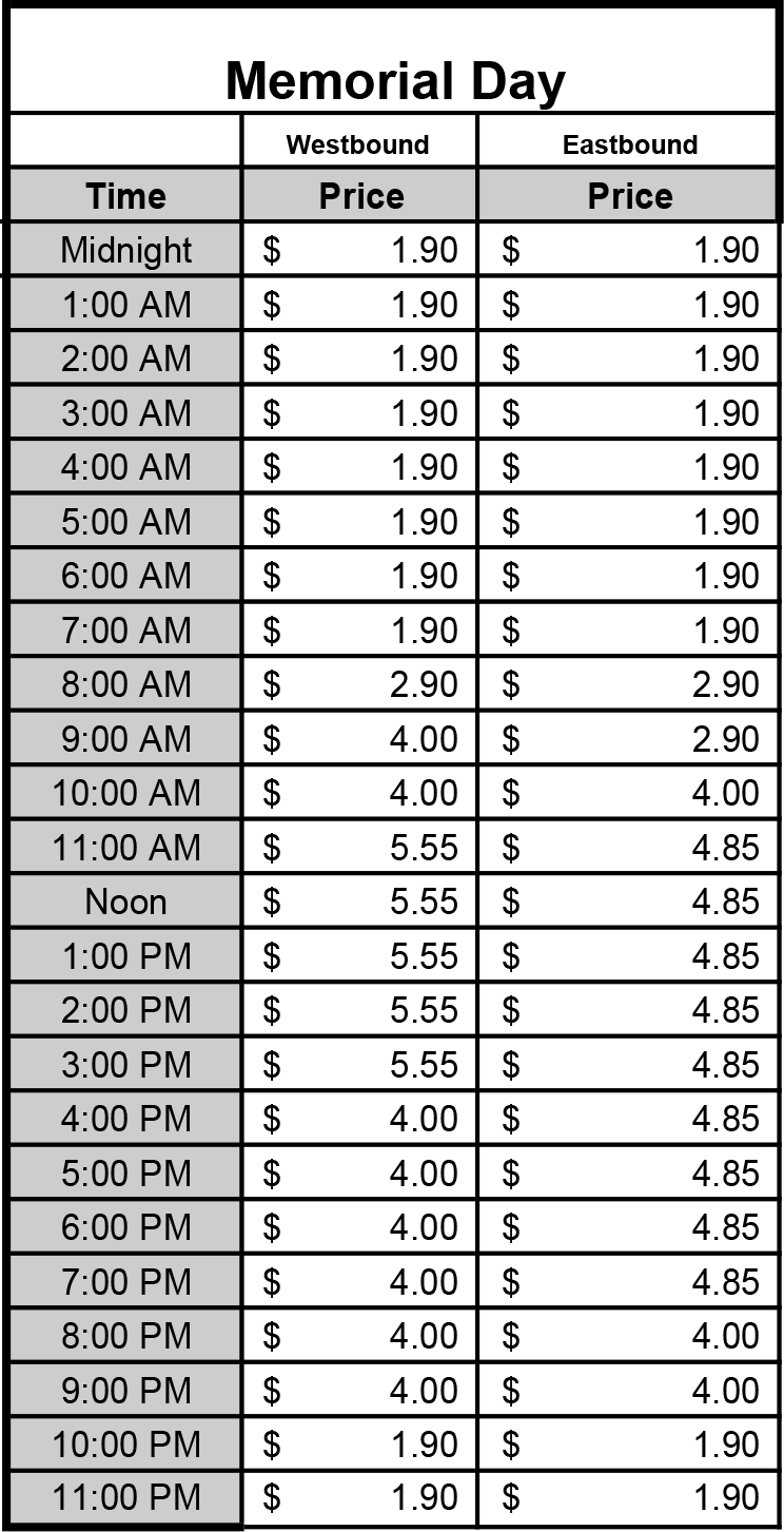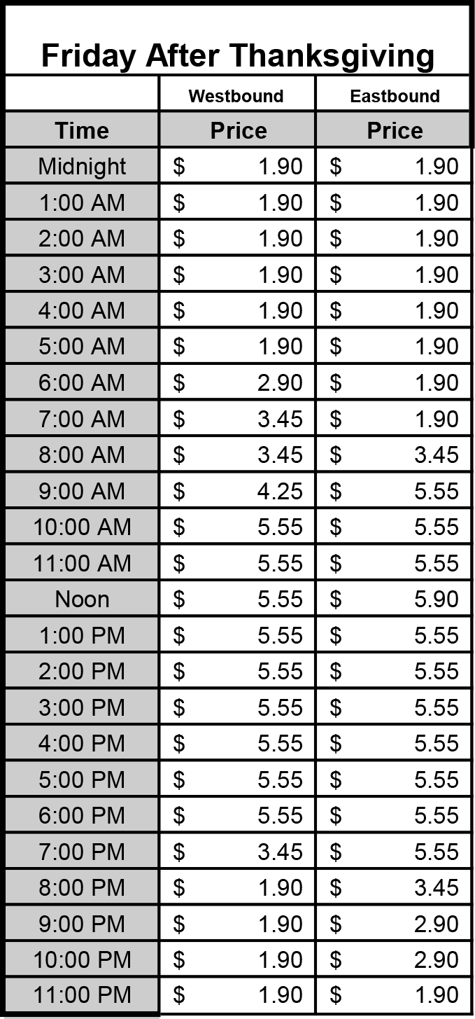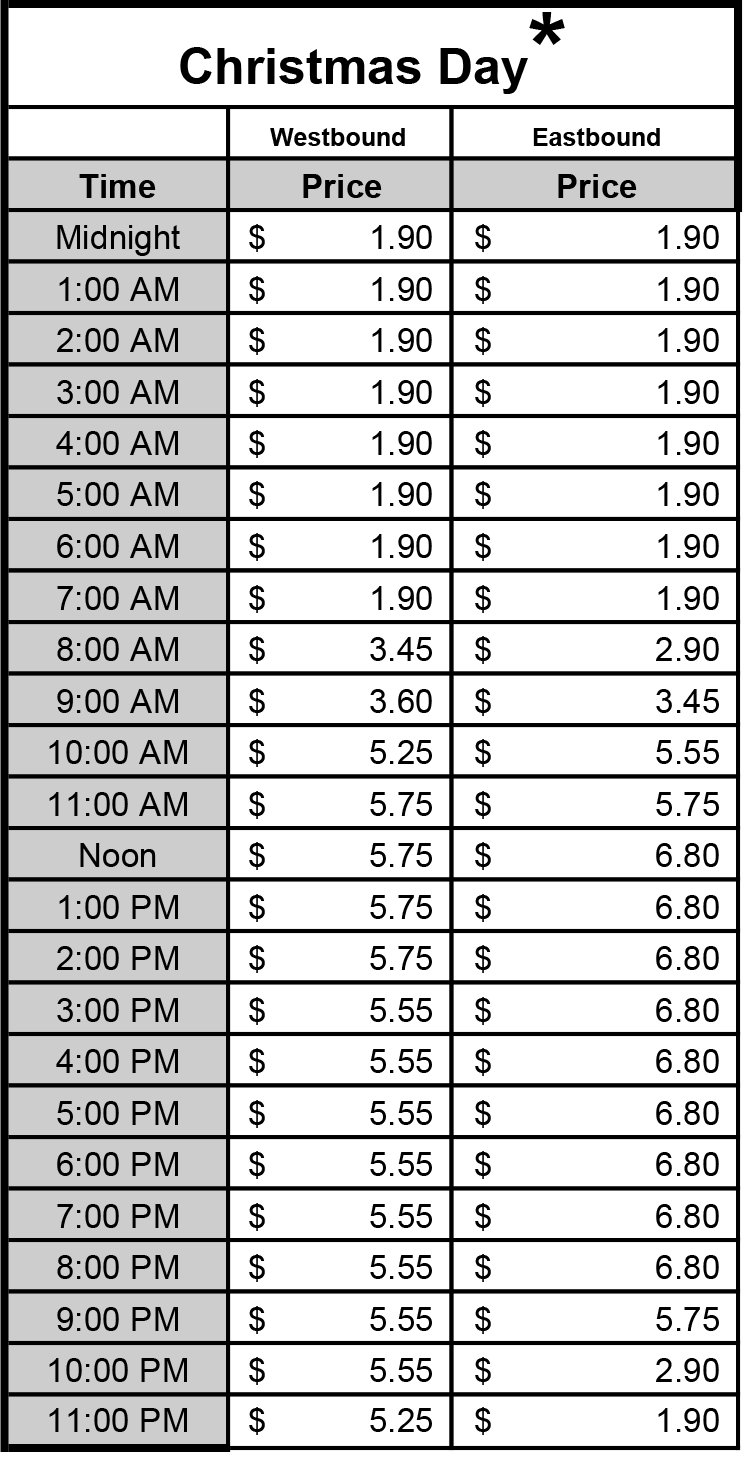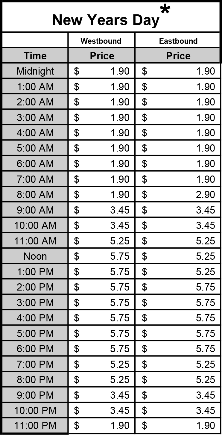 * The intent of the holiday schedule is to offer tolls that reflect holiday traffic patterns. If Christmas, New Years or Fourth of July falls on a Tuesday, Wednesday, Thursday, or Friday, the regular Friday toll schedule will be used the day before the holiday. If the day after Christmas, New Years or Fourth of July is a Friday or Monday, it is assumed these are traditionally light traffic days, therefore, a reduced rate applies (Friday after Thanksgiving rate will be used). If Christmas, New Years or Fourth of July fall on Saturday, it is assumed the Friday before is a traditionally light traffic day; therefore the stated Christmas, New Years or Fourth of July holiday toll schedule applies. It is also assumed that the Thursday before is a heavy traffic day, therefore the regular Friday schedule applies.