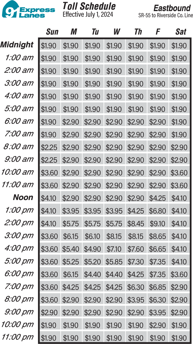 The 91 Express Lanes travel through portions of Orange and Riverside countries and toll charges vary.
